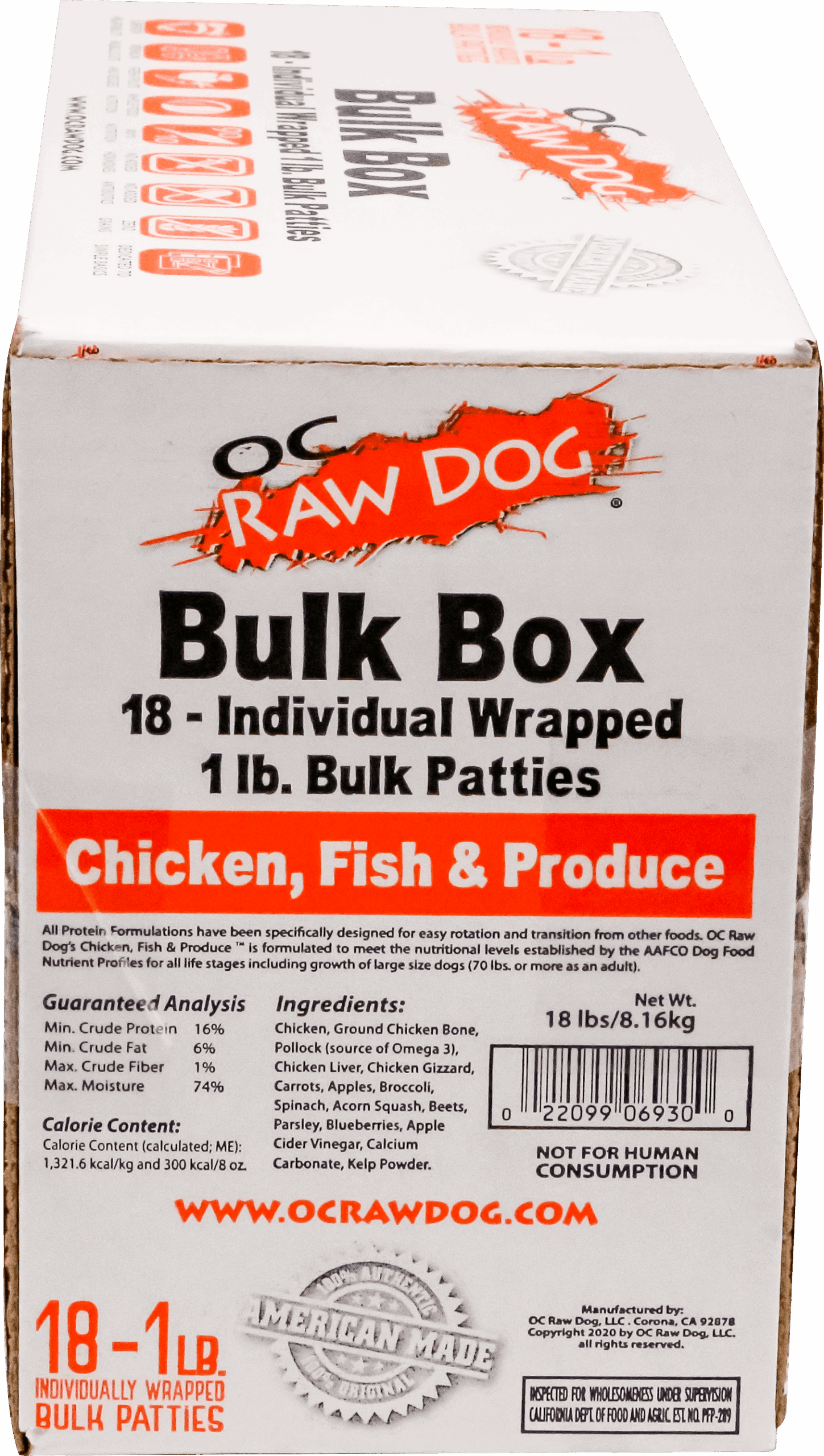 This is the same recipe as the Chicken & Produce but with added fish to increase Omega 3/6/9. As with the Chicken & Produce the chickens are always raised without hormones or antibiotics. The birds are grown, raised, and processed in the USA. We use approximately 90% animal content and use premium muscle cuts so the meat to bone ratio is smaller while protein content derived from animal muscle meat is higher compared to other commercial raw brands who claim 95/5.