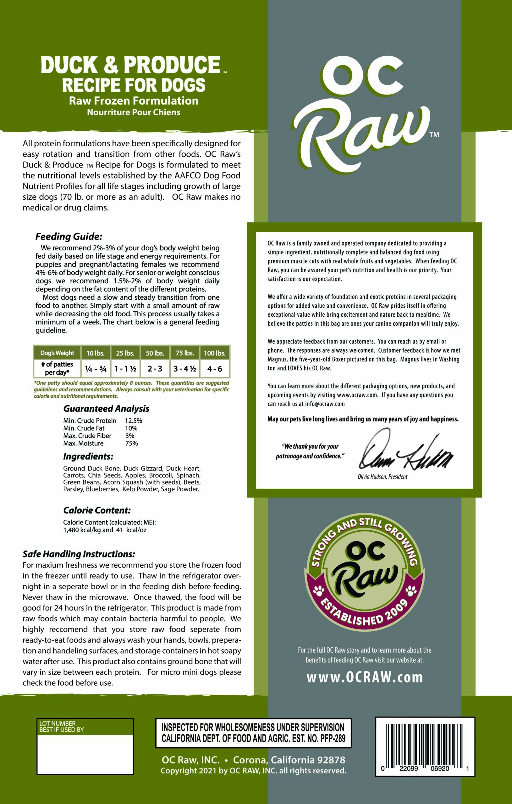 Ducks are raised without hormones or antibiotics. The birds are grown, raised, and processed in the USA and Europe. We use approximately 90% animal content. The animal based ingredients consist of premium muscle cuts so the meat to bone ratio is smaller while protein content derived from animal muscle meat is higher compared to other commercial raw brands who claim 95/5. Purpose: alternative poultry option with higher fat content.
