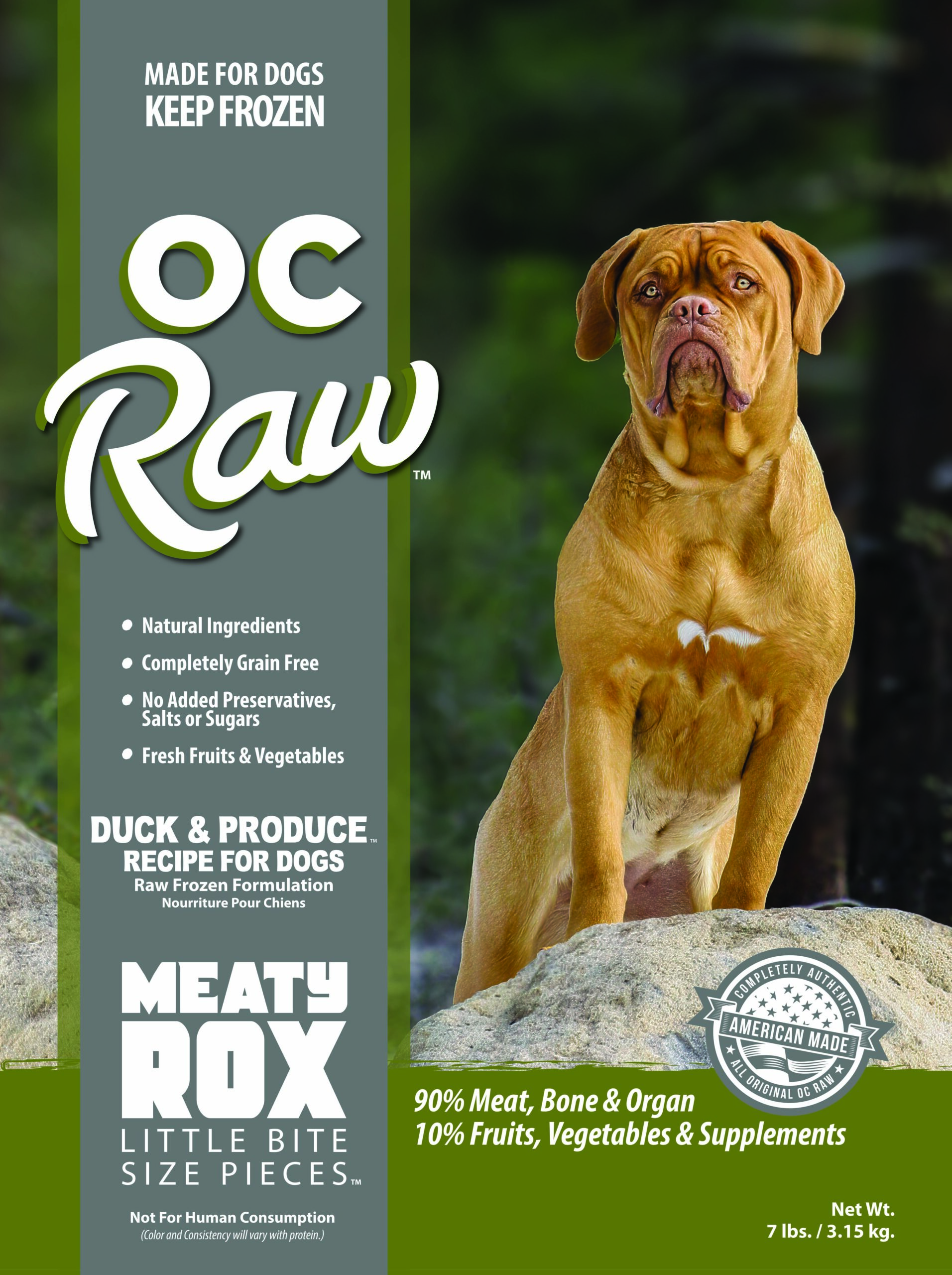 Ducks are raised without hormones or antibiotics. The birds are grown, raised, and processed in the USA and Europe. We use approximately 90% animal content. The animal based ingredients consist of premium muscle cuts so the meat to bone ratio is smaller while protein content derived from animal muscle meat is higher compared to other commercial raw brands who claim 95/5. Purpose: alternative poultry option with higher fat content.