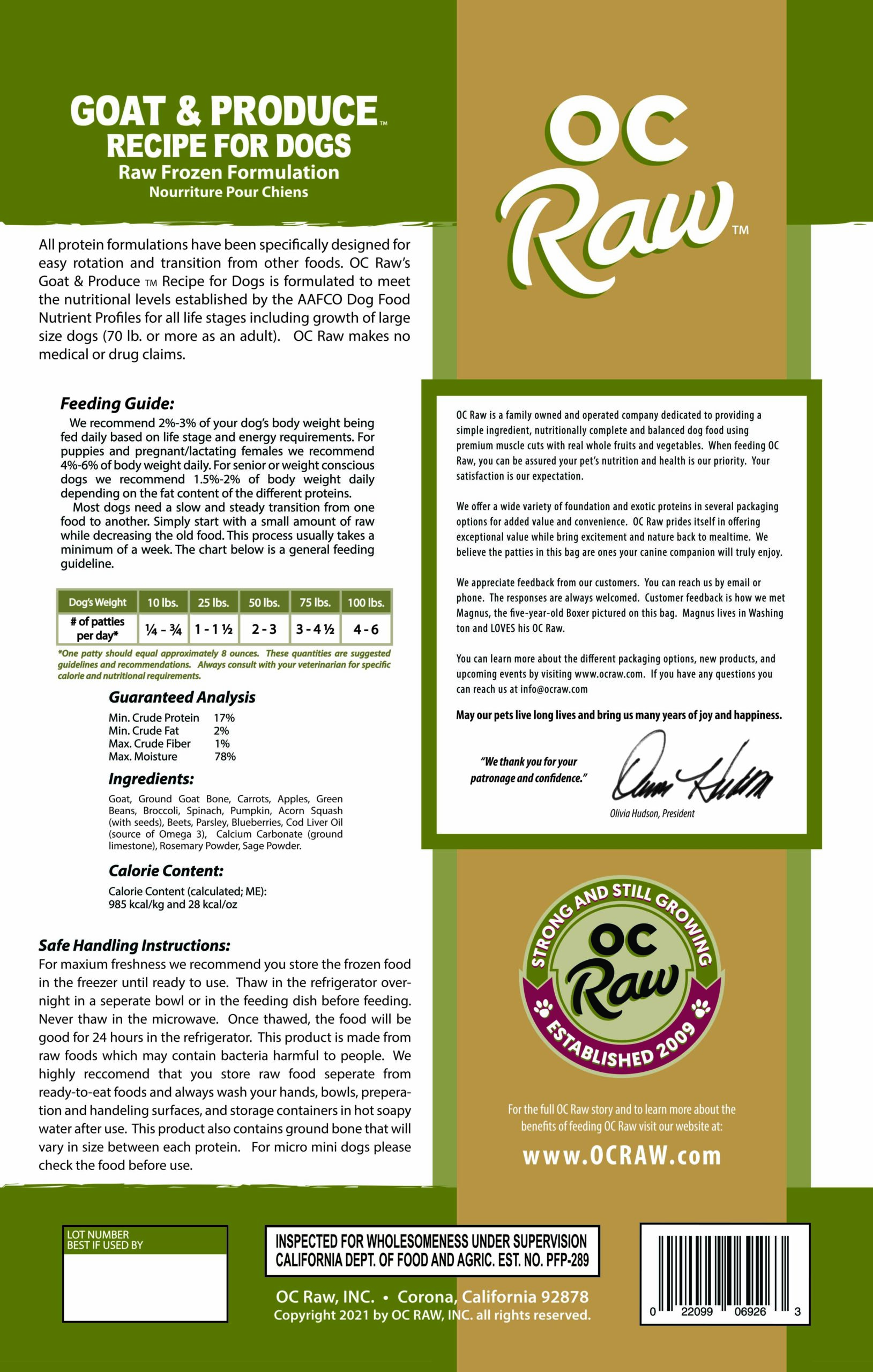 Transitioning to a new food varies from pet to pet. What works for one may not work for another. Those with hearty digestive systems can transition quicker, even cold turkey without any significant side effects. While other dogs benefit and may require a slow, steady transition ranging from a few days to several weeks. Simply start with a small amount of OC Raw to your current food and every day or every few days increase the amount of OC Raw while decreasing the old food.