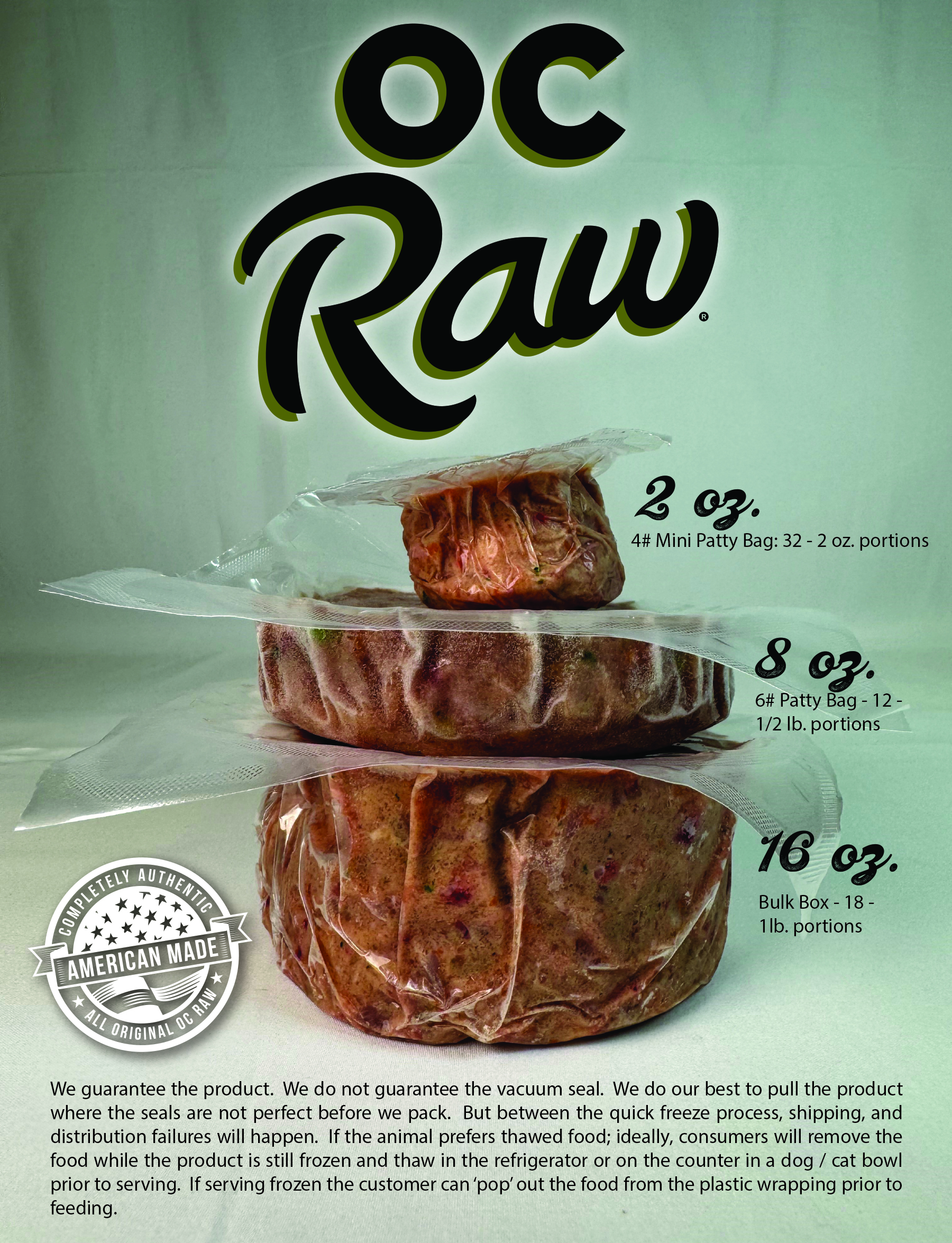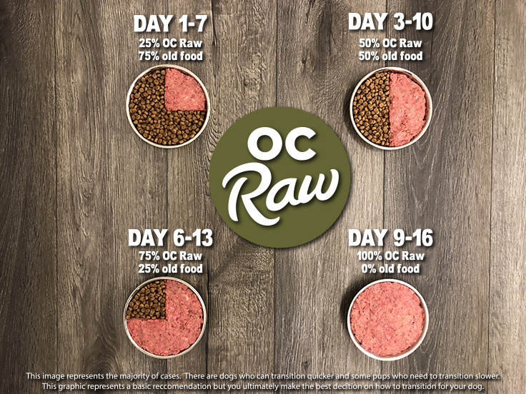 Transitioning to a new food varies from pet to pet. What works for one may not work for another. Those with hearty digestive systems can transition quicker, even cold turkey without any significant side effects. While other dogs benefit and may require a slow and steady transition from ranging from a few days to several weeks. Simply start with a small amount of OC Raw to your current food and every day or every few days increase the amount of OC Raw while decreasing the old food.