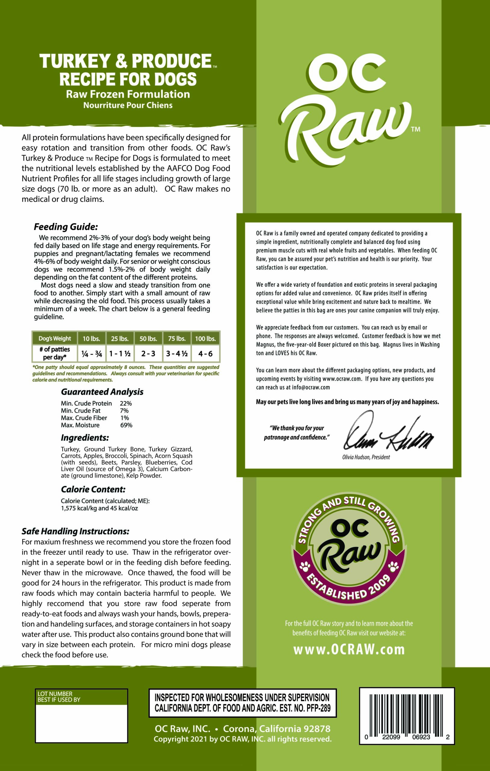 Transitioning to a new food varies from pet to pet. What works for one may not work for another. Those with hearty digestive systems can transition quicker, even cold turkey without any significant side effects. While other dogs benefit and may require a slow, steady transition ranging from a few days to several weeks. Simply start with a small amount of OC Raw to your current food and every day or every few days increase the amount of OC Raw while decreasing the old food.